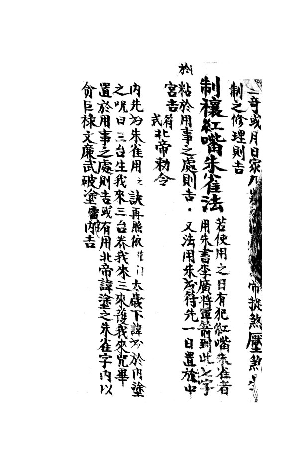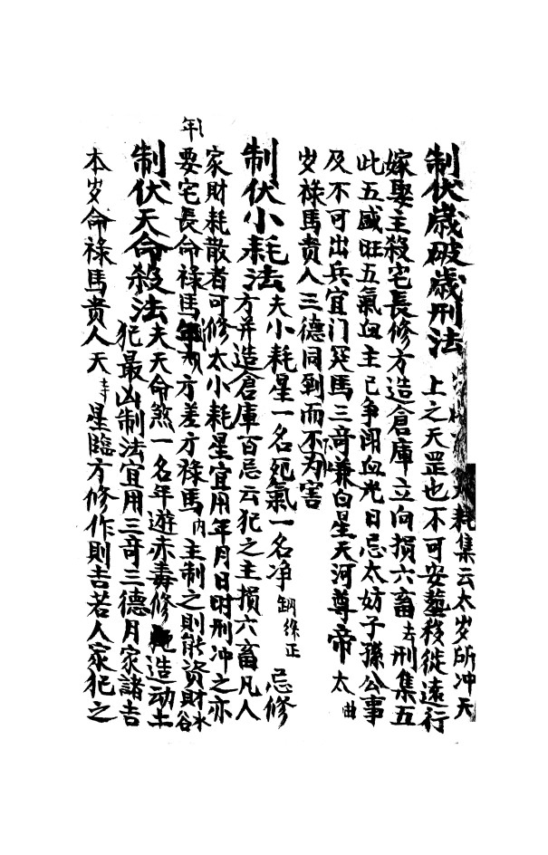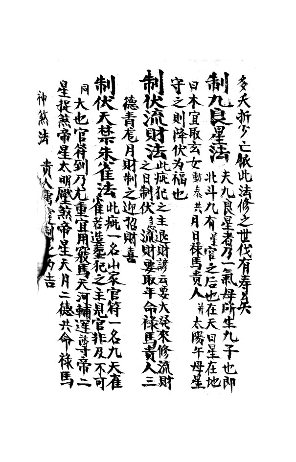 内容有:朱雀,玄武,青龙,白虎吉凶煞法,制神煞总法,四大吉时定局,鬼谷子九仙合数推时法,九天秘传金符经,制阴府太岁法,制三煞法,制退法,制官符法,制金神法,解木匠魔魅法,制将军箭法,制太岁法,制伏天命殺法,制伏山家血刃值山血刃法,制让红嘴朱雀法等。(边角有些许破损)