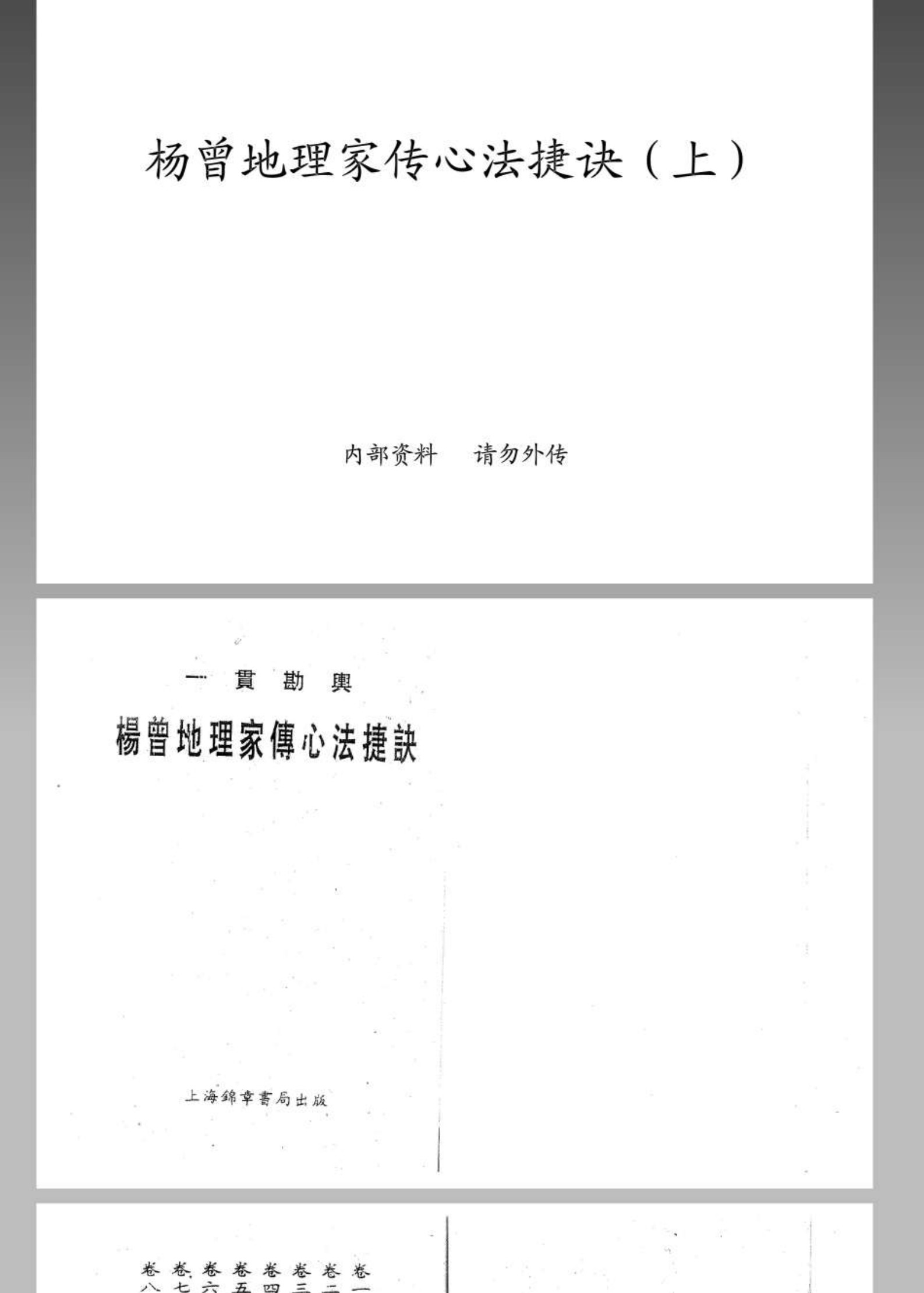 书名:《杨曾地理家传心法捷诀(上中下)》 年代:不详 页数:上中下共586筒子页 PDF大小:上中下共98M 声明:本站所有文章,如无特殊说明或标注,均为本站原创发布。任何个人或组织,在未征得本站同意时,禁止复制、盗用、采集、发布本站内容到任何网站、书籍等各类媒体平台。如若本站内容侵犯了原著者的合法权益,可联系我们进行处理。
