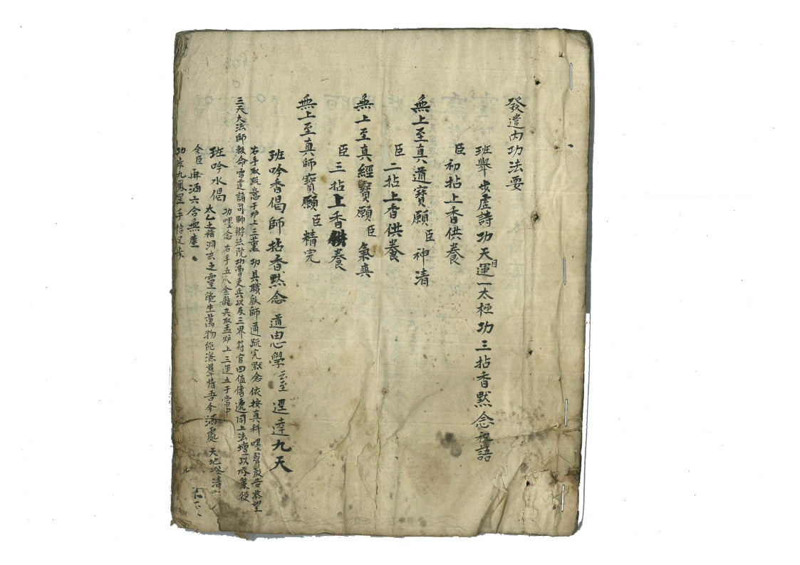 内容有:发遣内功法要,九凤破秽法,三光气法,三清讳,五方气法,煞气法,金光气法,大净秽,封文书一事,变神骨头,变神仙法,金光咒三十六雷音,五火变,剔斗布罡诀,发遣文,城隍,土地、破地狱法等。