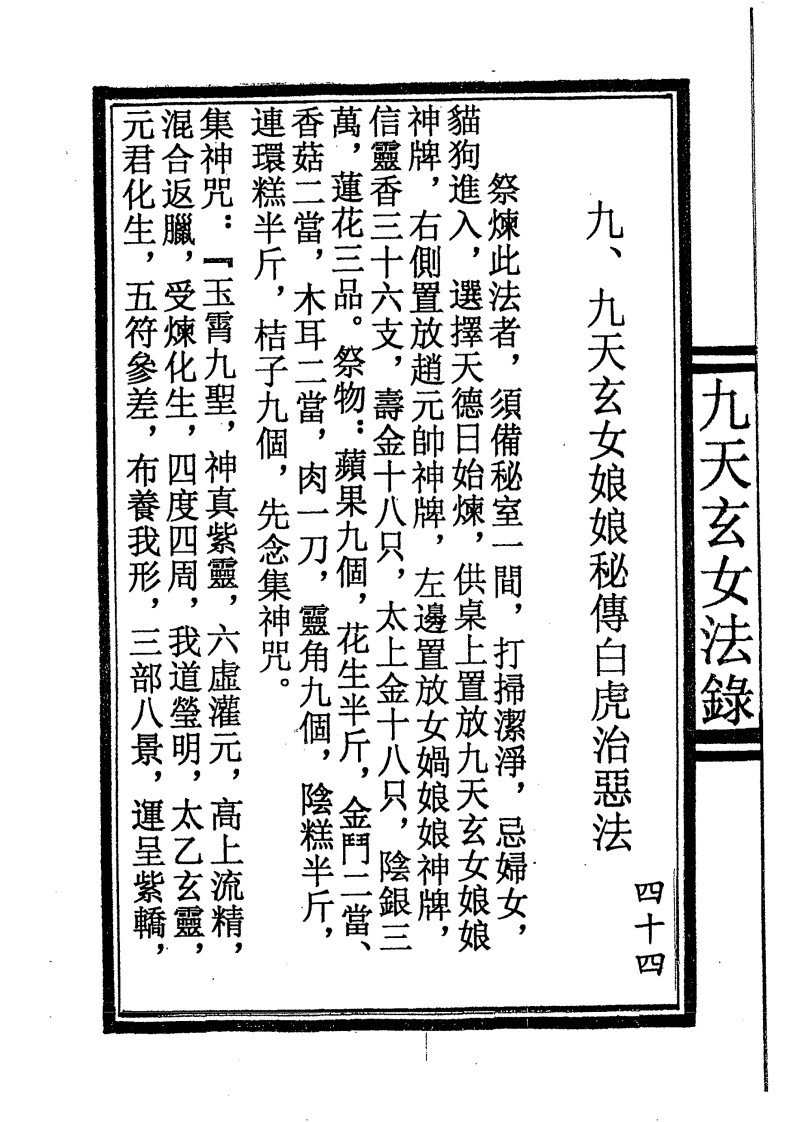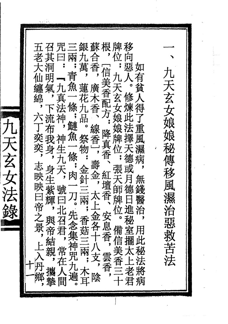 内容有:九天玄女娘娘秘传風濕治恶救苦法,七仙迷魂法,月佬婚姻法,移伤病治恶法,五子搬运法,五路阴兵法,七煞治恶法,白虎治恶法等。