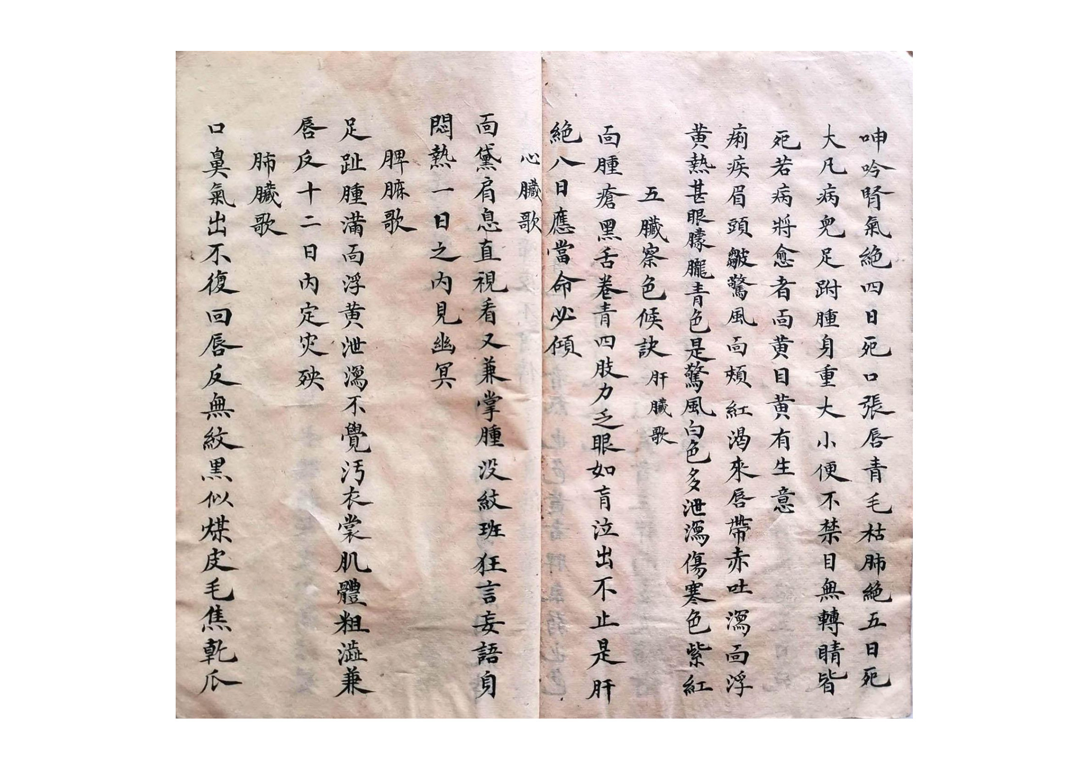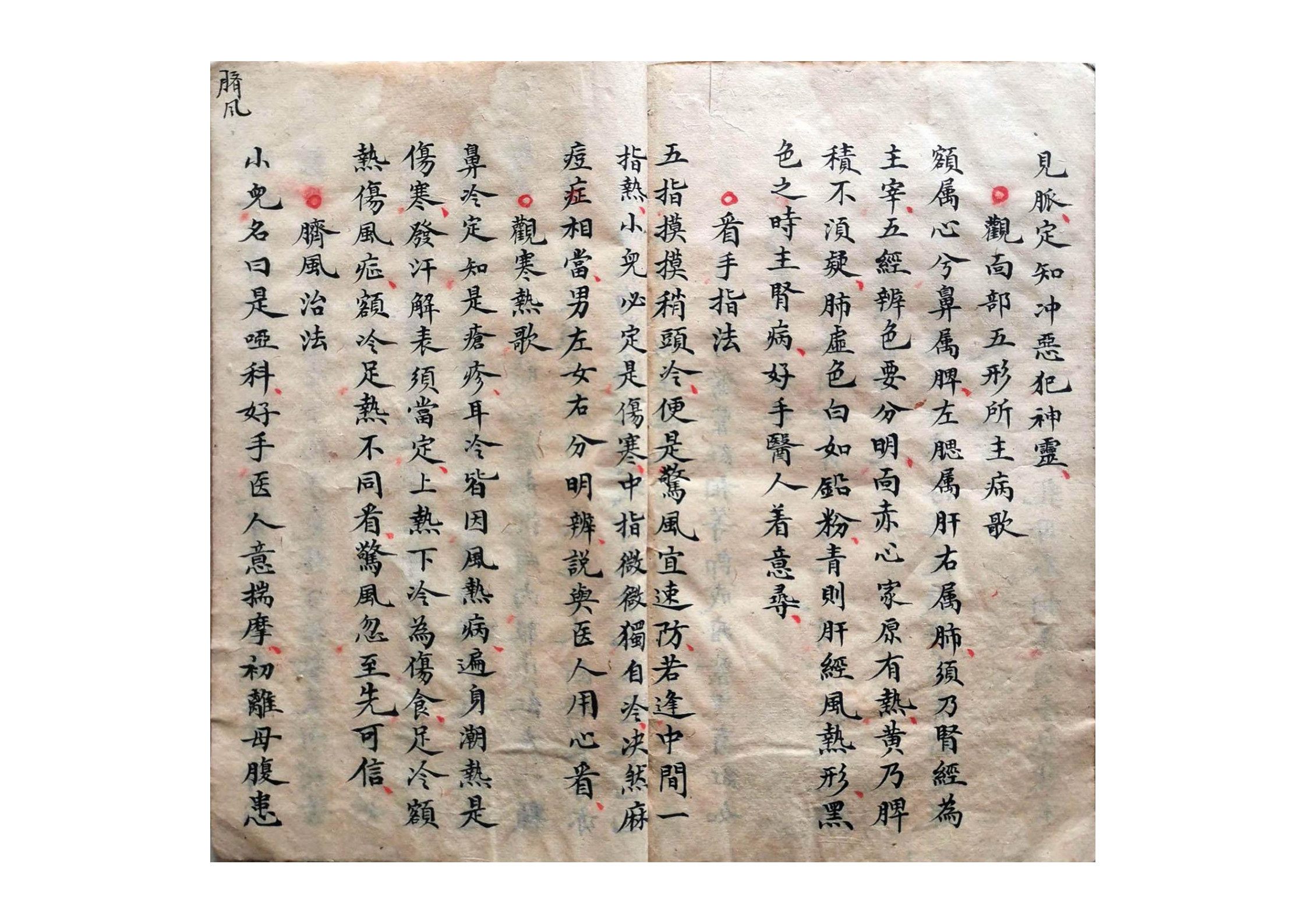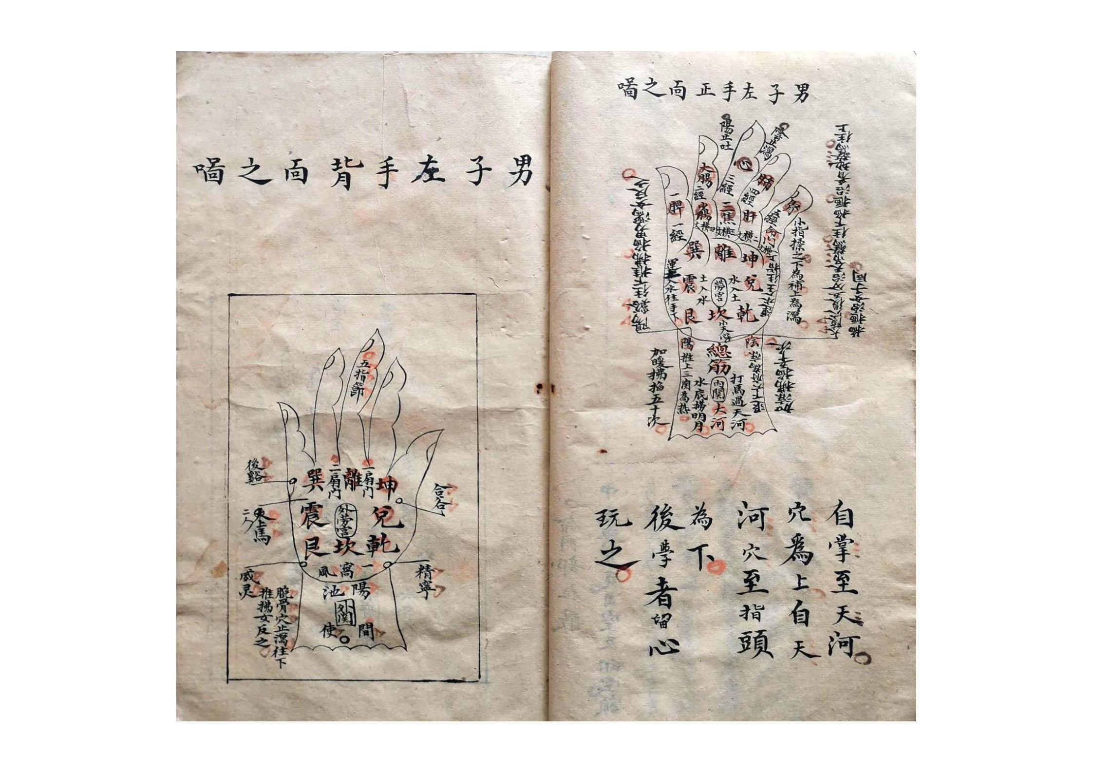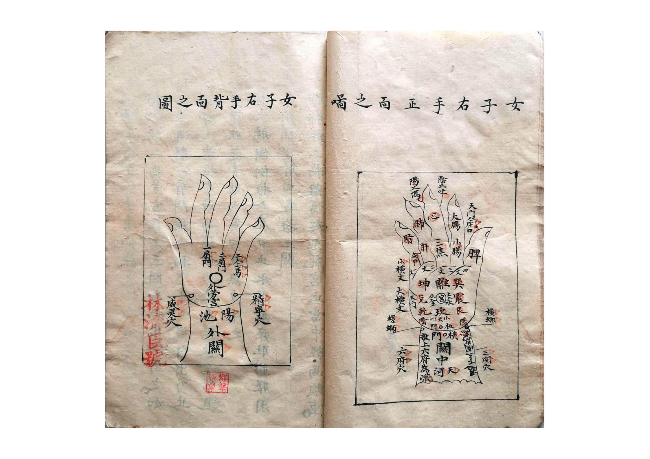 内容有:手法歌、观形察色法、论色歌、男子左手正面之图、男子左手背面之图、女子右手正面之图、女子右手背面之图、隂掌图各穴手法仙诀、戒逆针灸、六筋图、看脉诀法、观经纹法、看危症法等等。