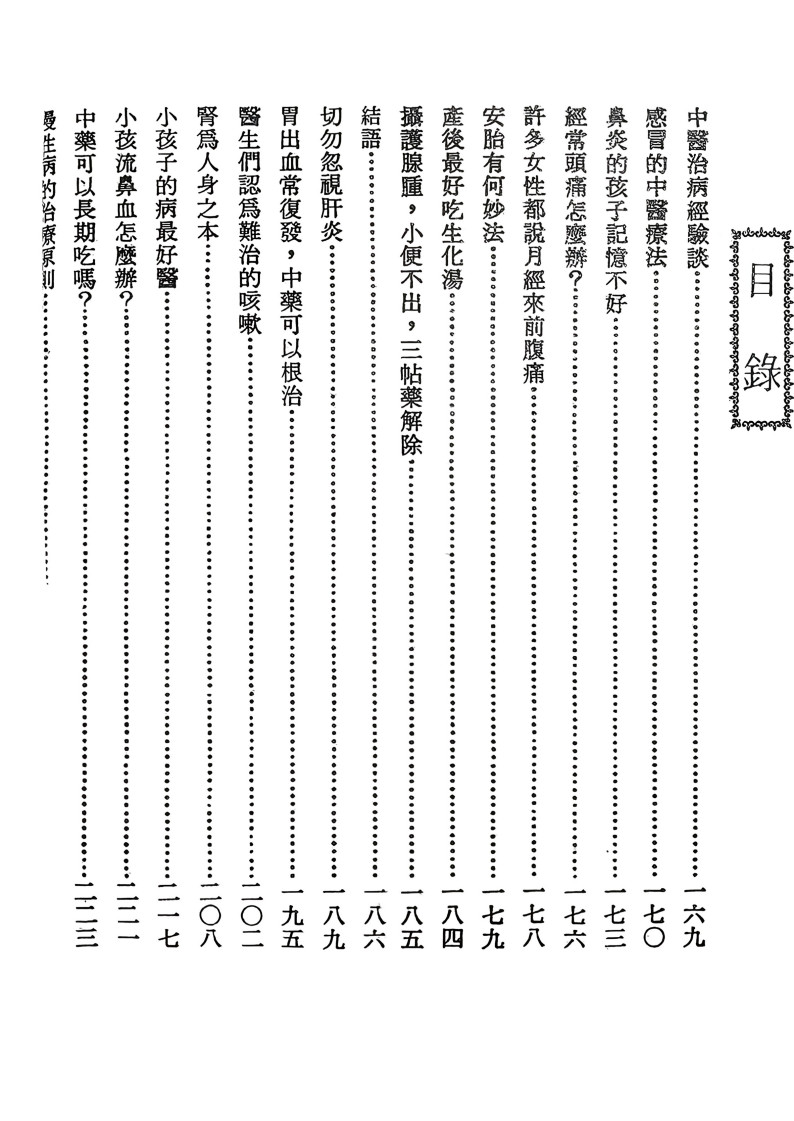 内容有:中医治病经验谈、感冒的中医疗法、鼻炎的孩子记忆不好、经常头痛怎么办、许多女性都说月经来前腹痛、安胎有何妙法、产后最好吃生化汤、切勿忽视肝炎、小孩的病最好医等等。