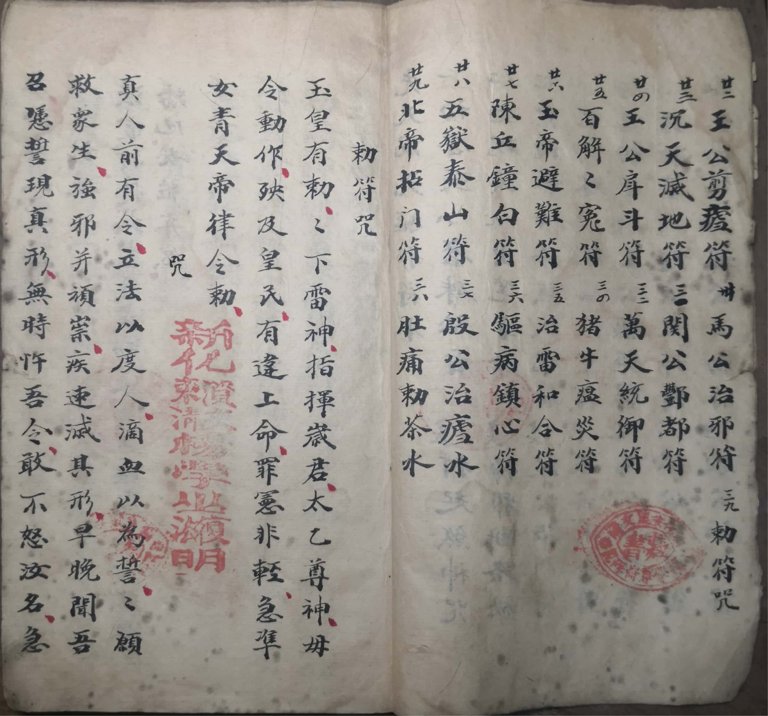 内容有:勅符咒、勅水咒、勅砂咒、勅纸咒、勅墨咒、勅笔咒、殷公六甲符、王公符、赵工天师符、殷公三勅符、殷公符、殷公果字符、马公白蛇符、温天君符、温公符、王公剪疟符、百解解冤符、玉帝避难符、陈丘钟白四大将符、五岳泰山符、马公占符等等。