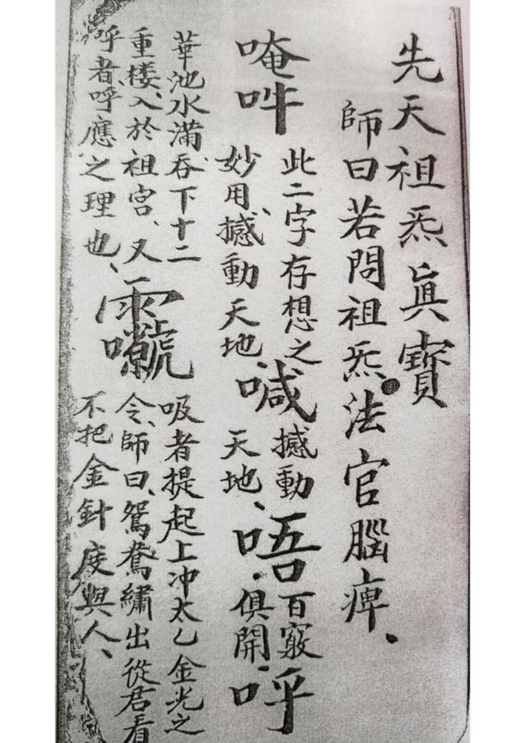 内容有:先天祖炁真宝、先天天罡秘旨、一取太阳炁诀、一取太阴炁法、一取金光炁诀、一取煞炁诀、一取胆炁法、祖师传太阴太阳五星六曜姓名、起天罡例、老本天罡起例、批无极太极祖炁总论、先天无极之图、河图等等。