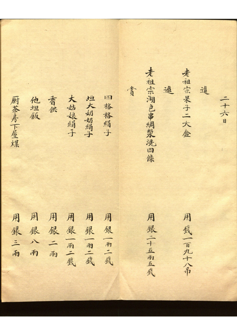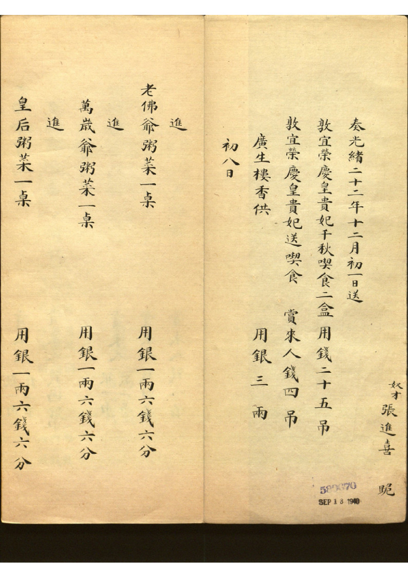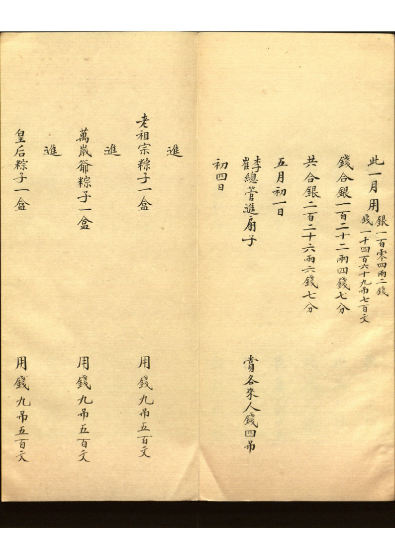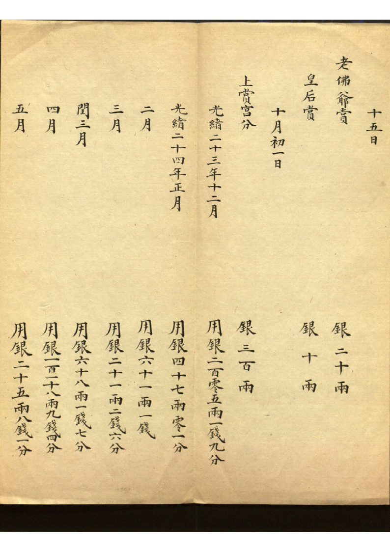 主要内容:此为宫内原始账册,记瑾妃每日(不连贯)收支,年末总计。 包括慈喜,光緖,皇后赏赐,嫔妃间赠送礼品耗银等情况。