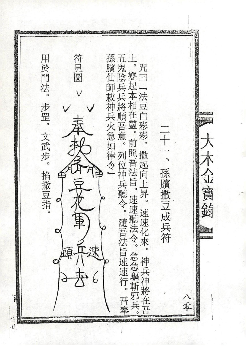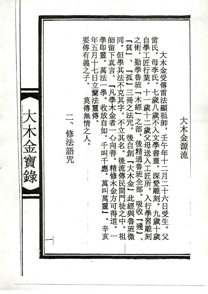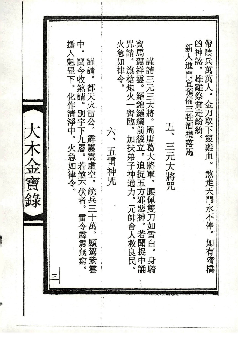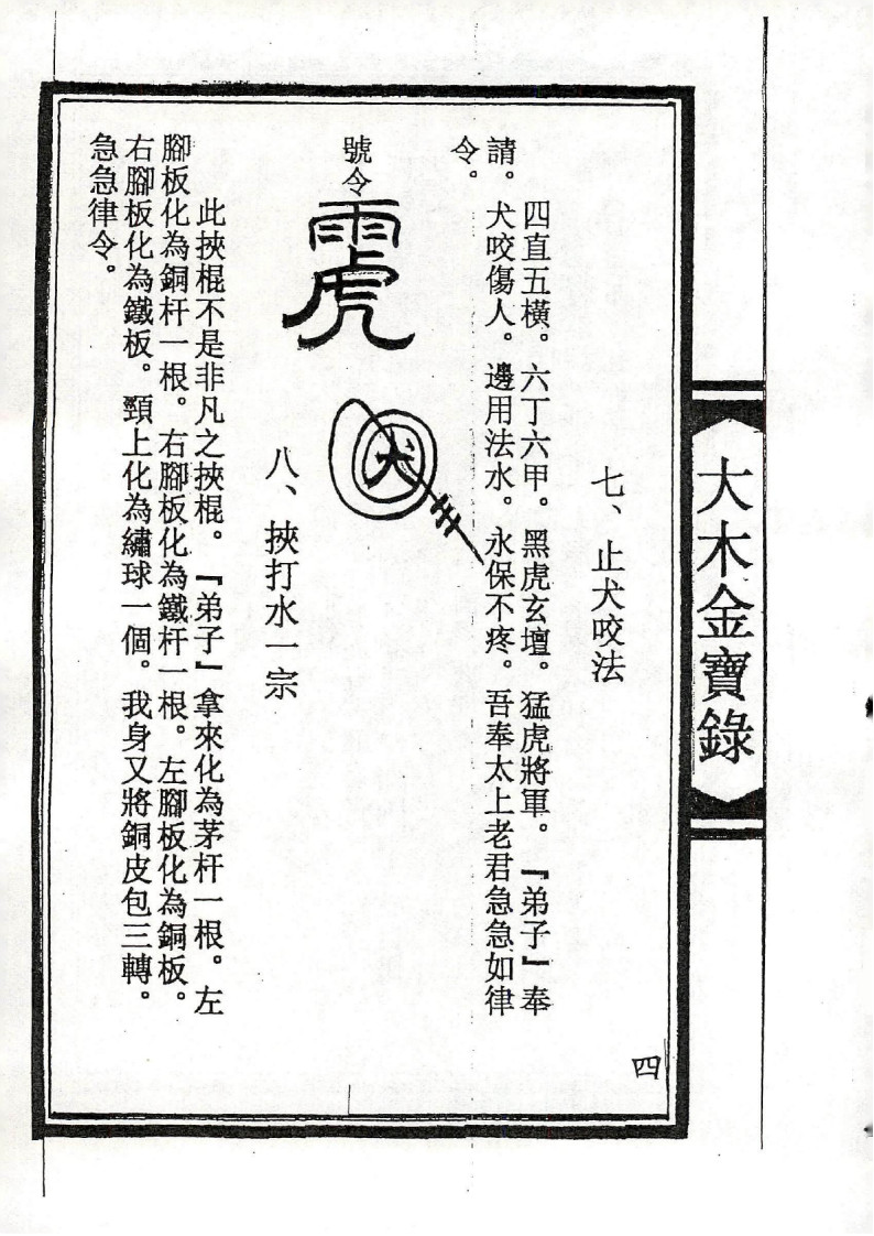 内容有:大木金源流、三元大将咒、五雷神咒、止犬咬法、神拳重诀一宗、草靴变鱼法、九龙神咒、坏人酱水法、隔山叫一宗、小水一宗、九龙化骨令、止痛一宗、收法一宗、罩皮法一宗、千斤摘法等等。