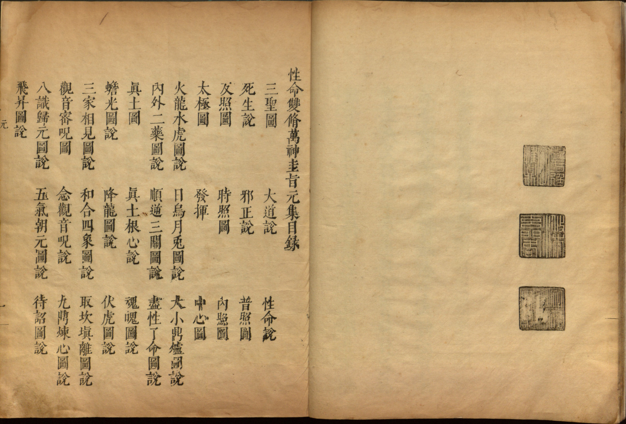 内容有:三圣图、大道说、性命说、死生说、邪正说、普照图、友照图、时照图、内照图、太极图、中心图、火龙水虎图说、日乌月兔图说、内外二药图说等等。